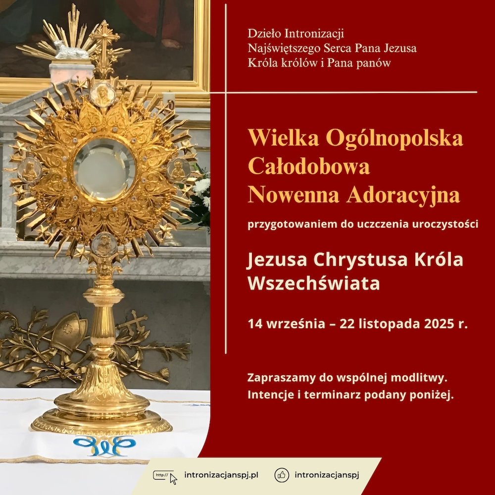 Od 1998 roku Wspólnoty Dzieła Intronizacji Najświętszego Serca Pana Jezusa Króla królów i Pana panów w Polsce, podejmują w swoich parafiach adoracje Najświętszego Sakramentu, aby upraszać łaski w życiu osobistym, rodzinnym i społecznym oraz wynagradzać Bożemu Sercu i Niepokalanemu Sercu Maryi za grzechy i zniewagi. W tym roku podejmujemy szczególną modlitwę za Kościół Święty, Biskupów i Kapłanów oraz o pokój w naszej Ojczyźnie i świecie. Obejmujemy apostolstwem kolejne parafie, zapraszamy grupy modlitewne i całe rodziny na modlitwę. Całodobowe czuwanie rozpoczyna się każdego dnia nowenny o godzinie 17. 00 Mszą św., i trwa do godz. 17. 00 następnego dnia. Tegoroczny terminarz jest podany poniżej.